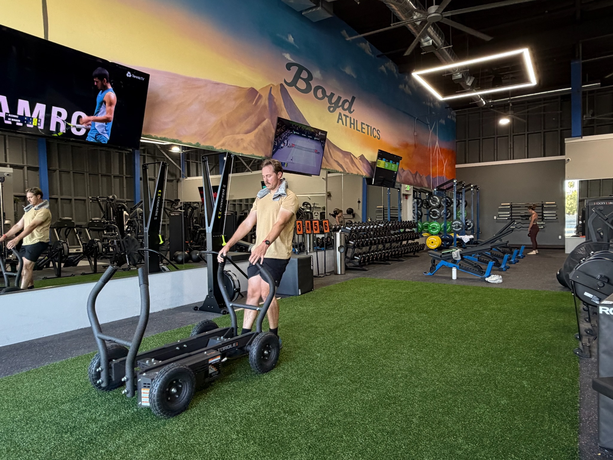 And while most people don’t join a gym for aesthetics, this place is genuinely beautiful. There’s a stunning desert landscape mural, greenery throughout the space, and even a quieter, more private section for stretching or floor workouts.